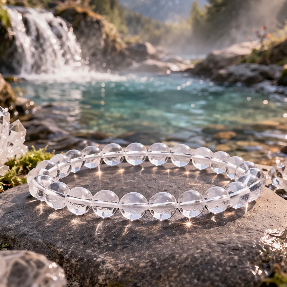 - Material: Natürlicher Bergkristall (klarer Quarz)