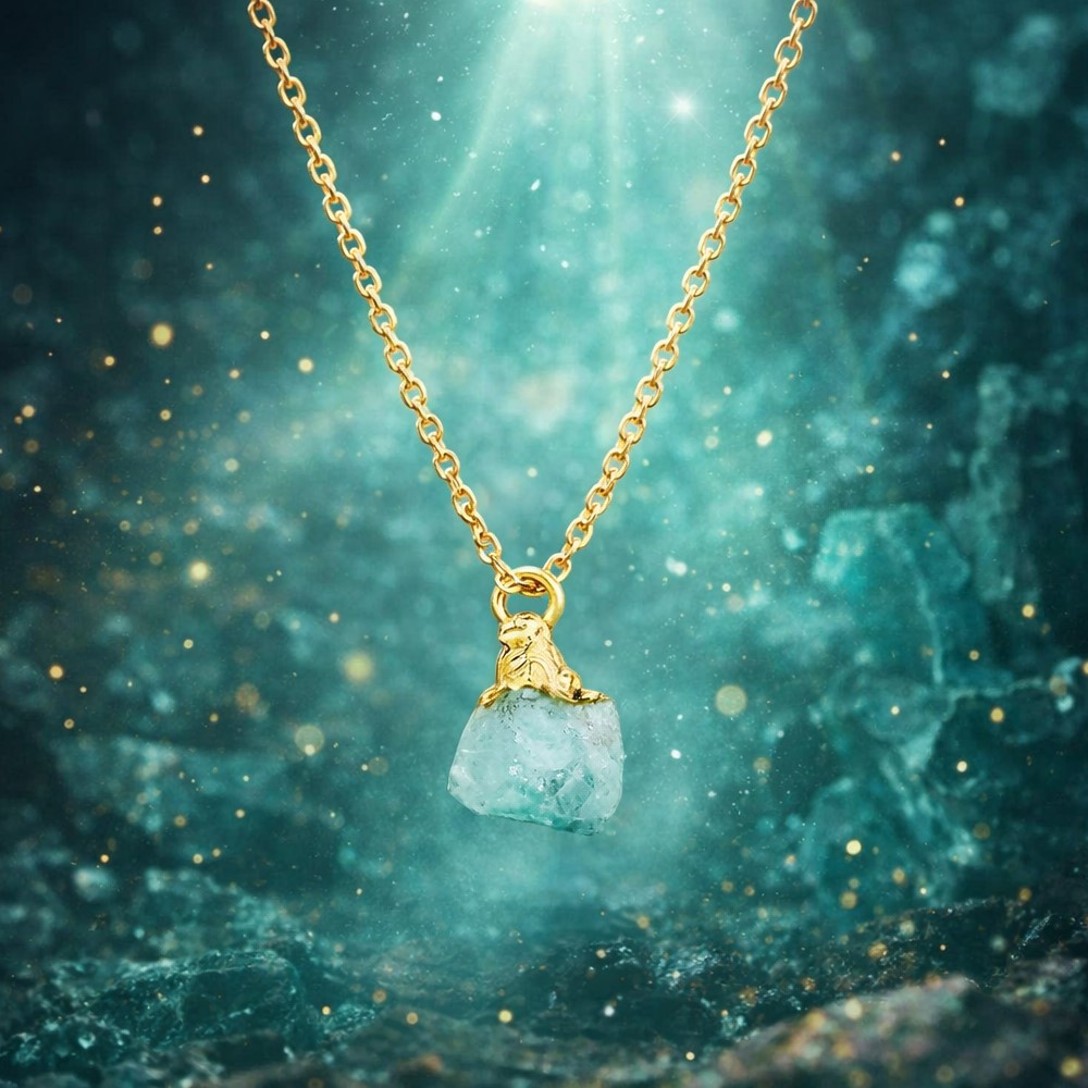 Diese stilvolle Kristallkette vereint natürliche Schönheit mit modernem Design. Der echte Türkis-Rohstein überzeugt durch seine einzigartige, unregelmäßige Form und seine sanften blau-grünen Farbnuancen – jedes Stück ist ein echtes Unikat.